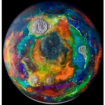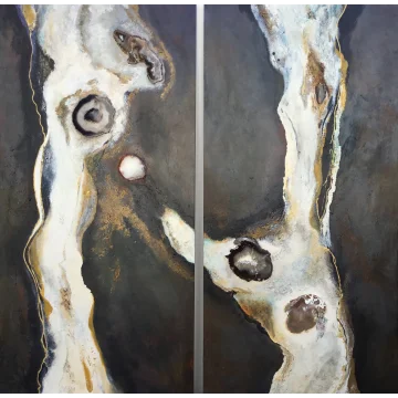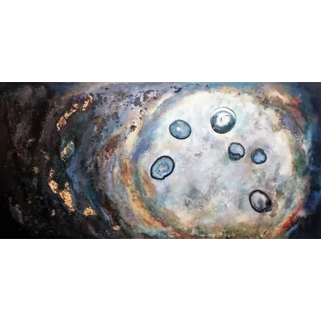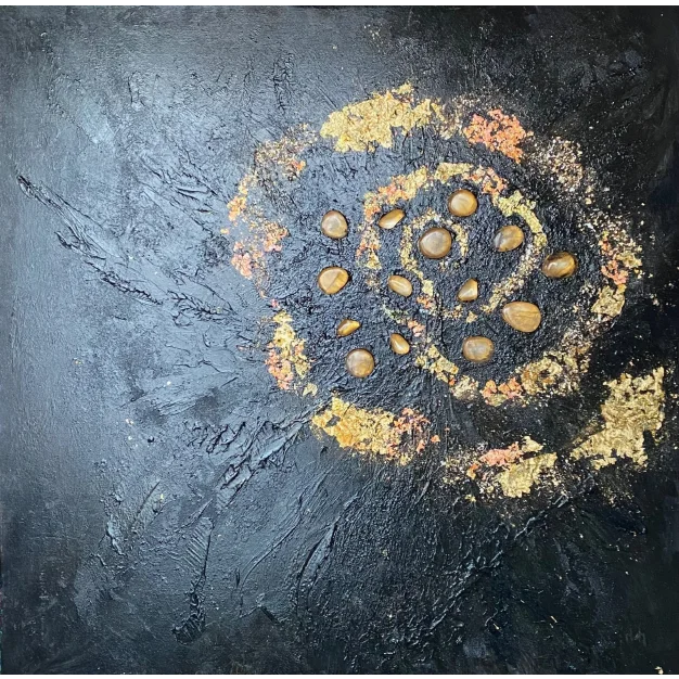 Black acrylics on wooden panel with gemstones and pieces of gold leafe